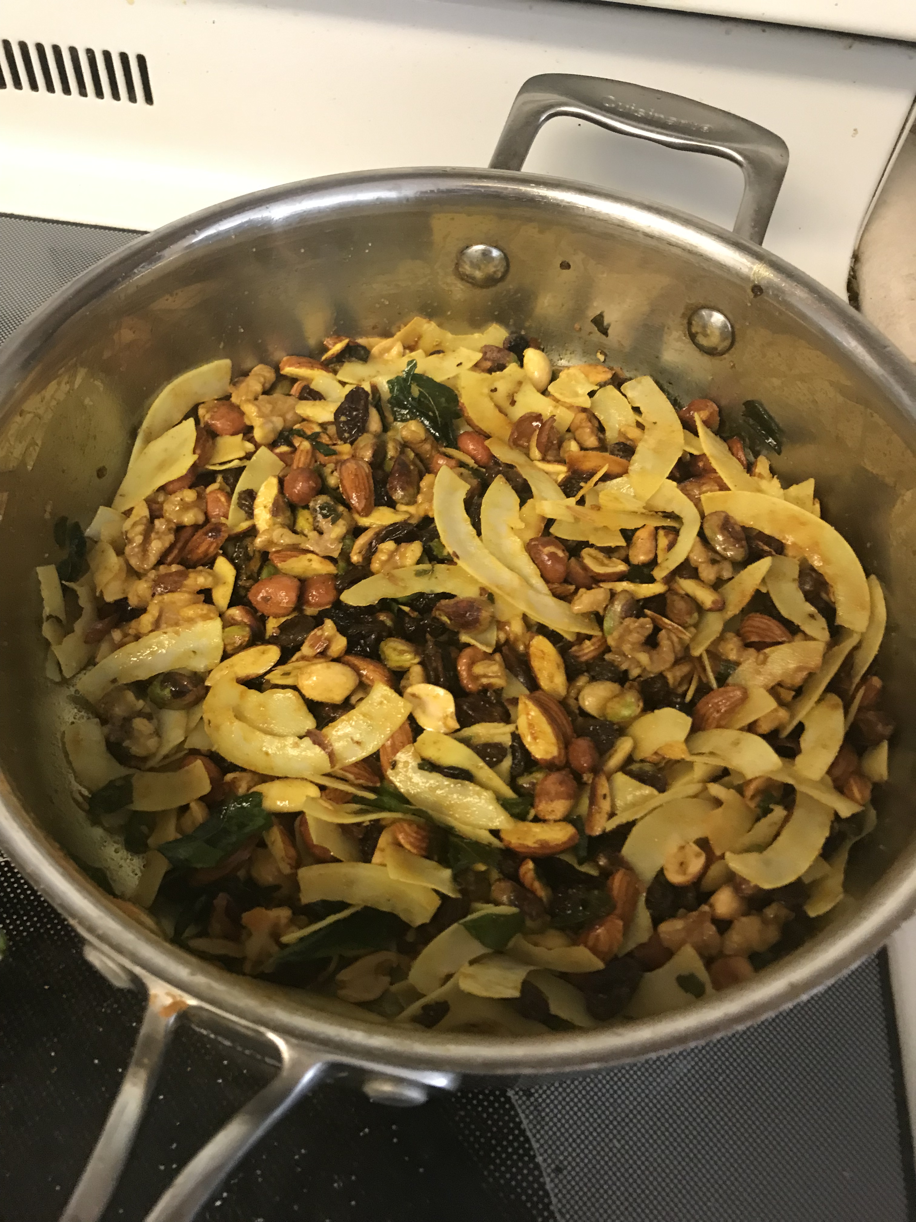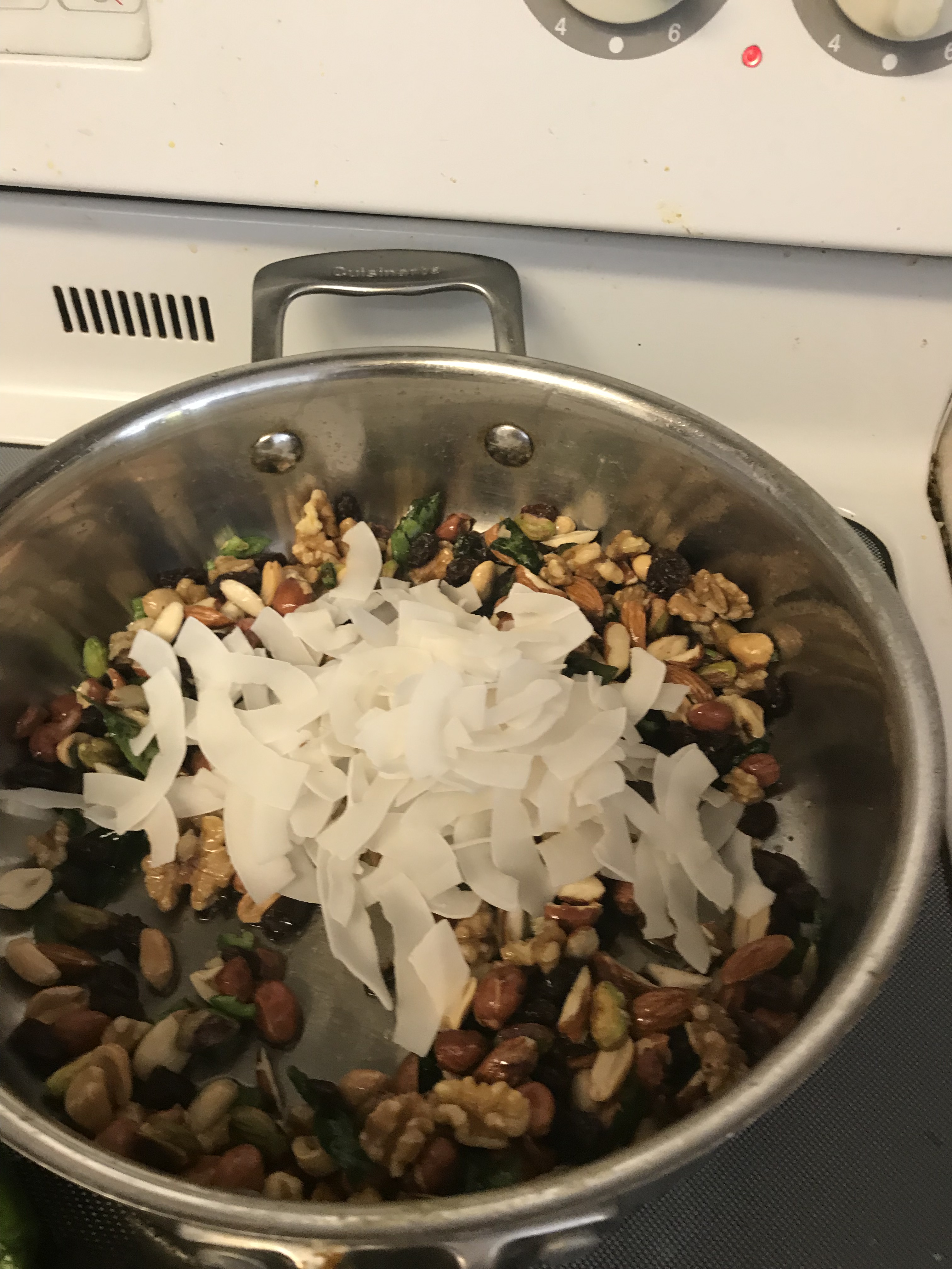 Now lower the heat to medium after 1/2 minute. Then add all the nuts, coconut flakes and raisins. Lastly add turmeric, salt and sugar.