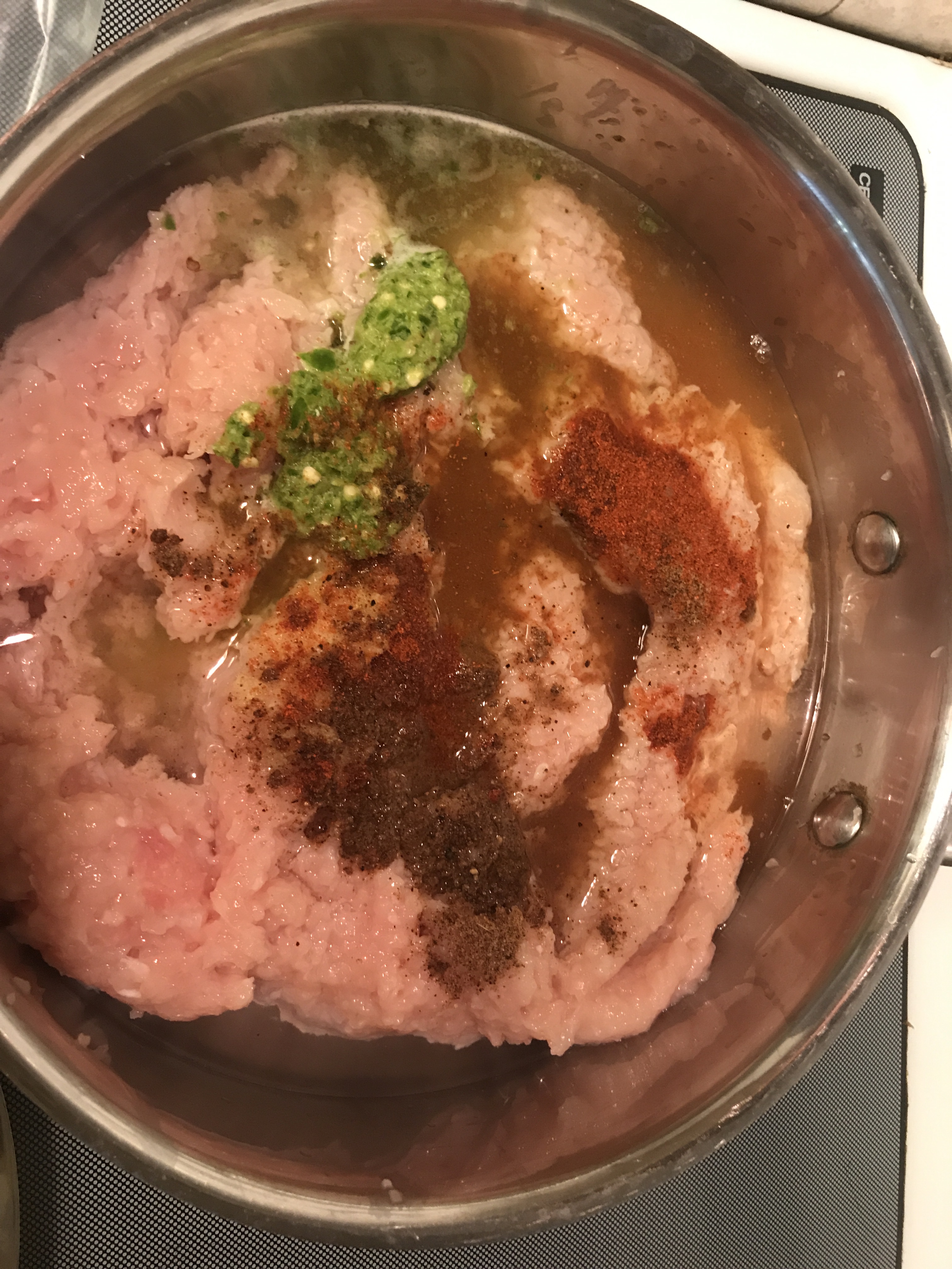 Put the ground chicken with all the ingredients except oil in a saucepan.