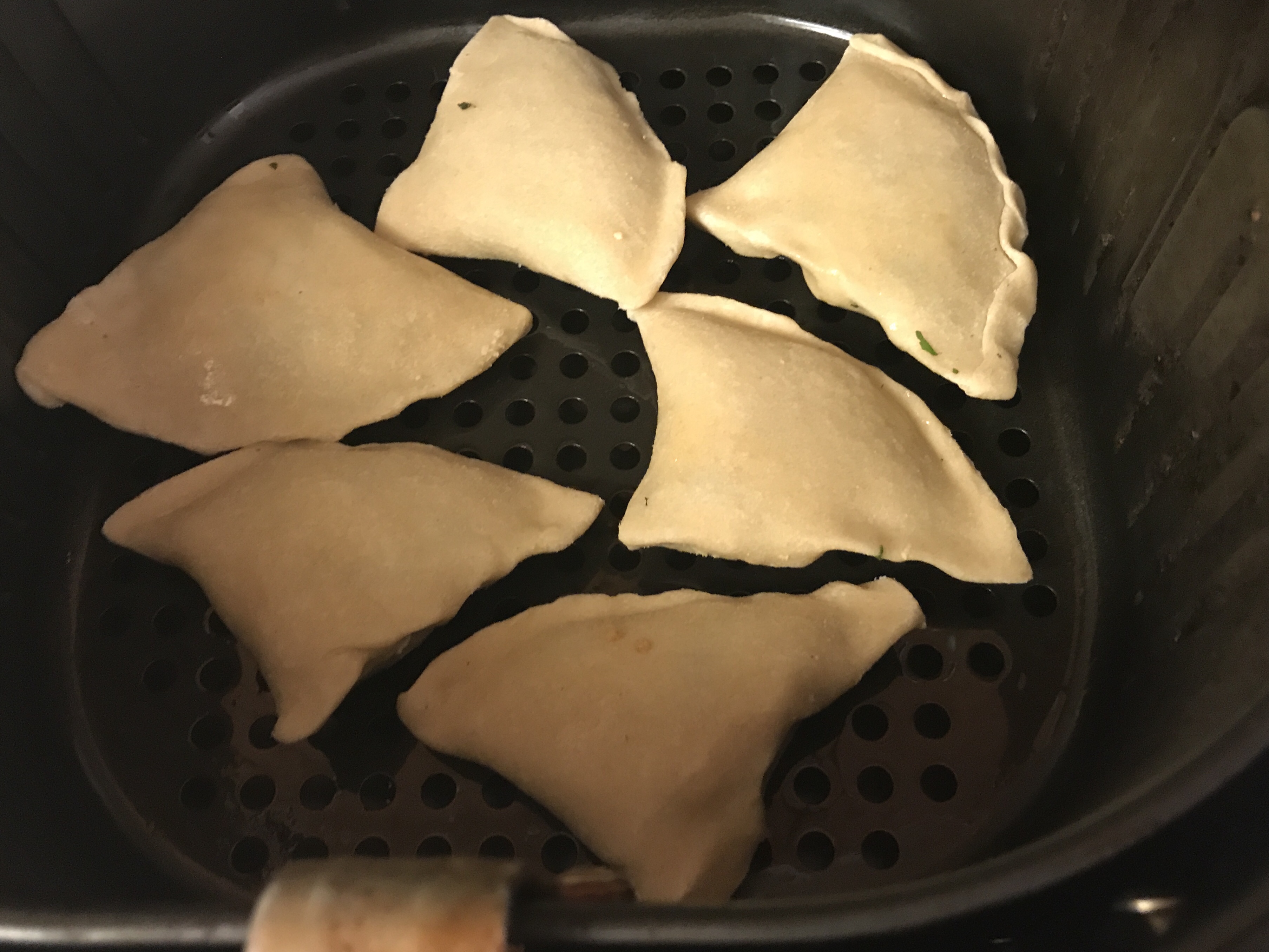 Before baking brush or spray with oil. Warm the oven to 400 F and bake for 20 minutes in oven, flipping them over after 10 minutes. If using air fryer set the air fryer to 400 F and bake for 10 minutes, flipping them over after 5 minutes. Only 6 samosas will fit in the air fryer.