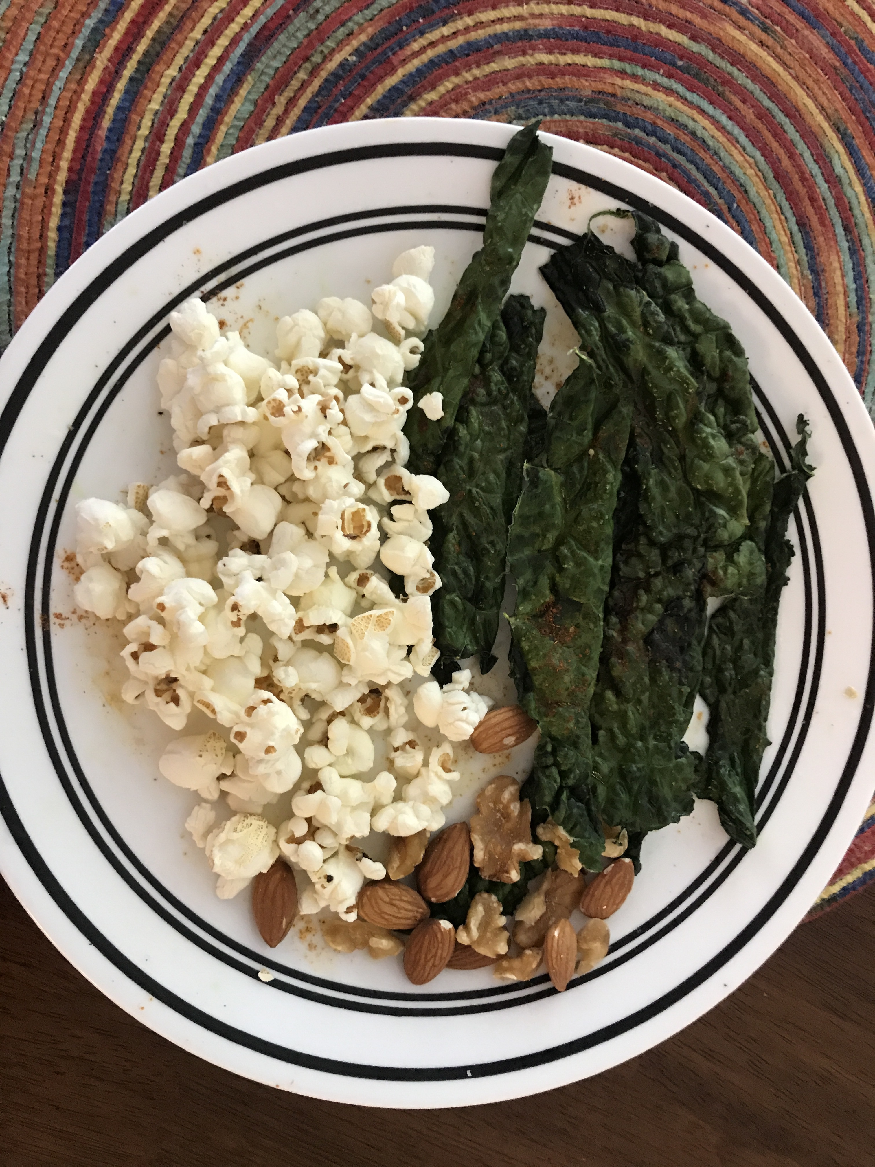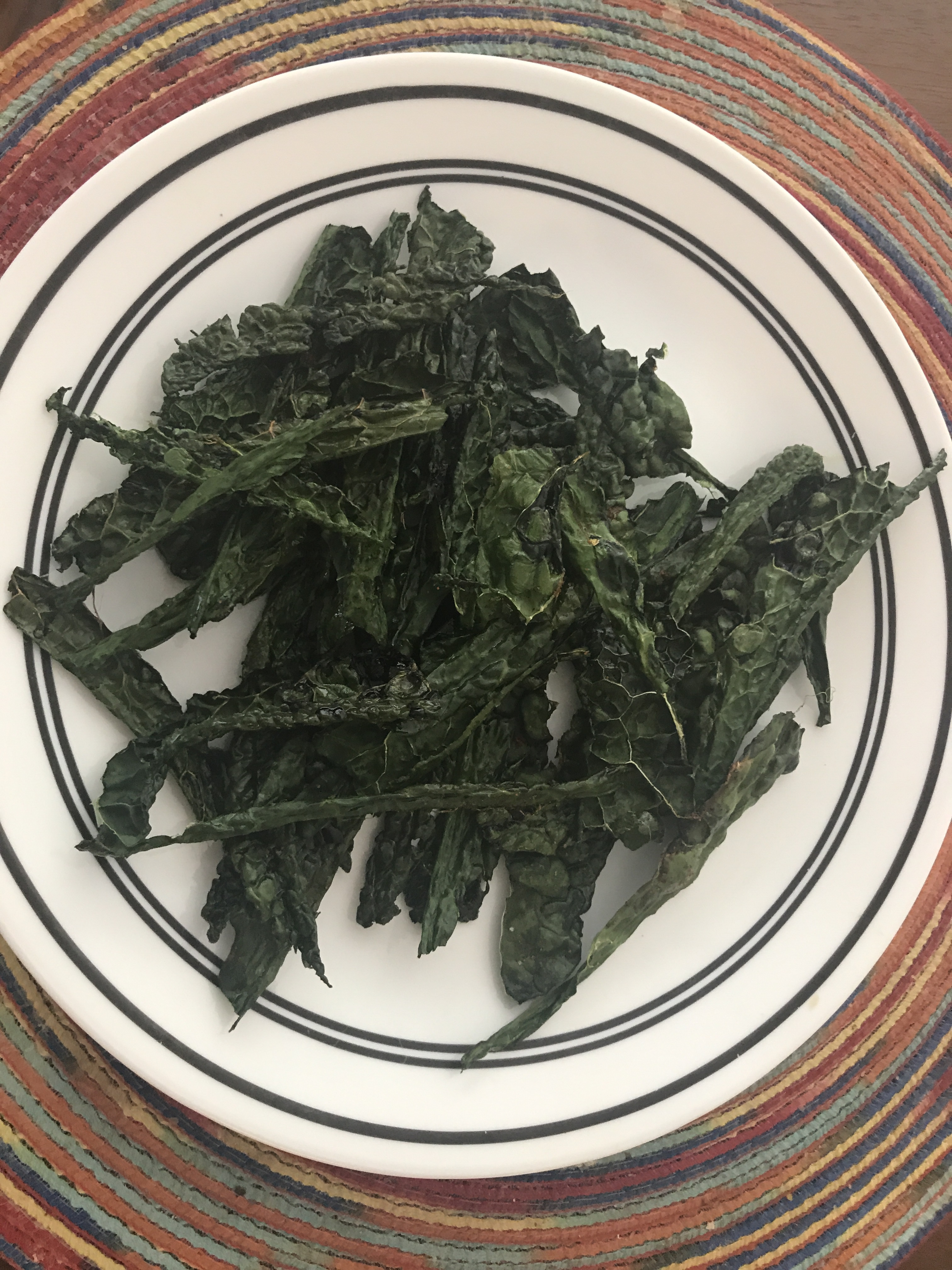 Wash all kale leaves. Remove the ribs. Spread them on a plate. Dab or spray with oil. Sprinkle with seasoning and salt. Put in the microwave for 3.5 minutes. That’s all!!! You can prepare a healthy and tasty snack in a few minutes:)