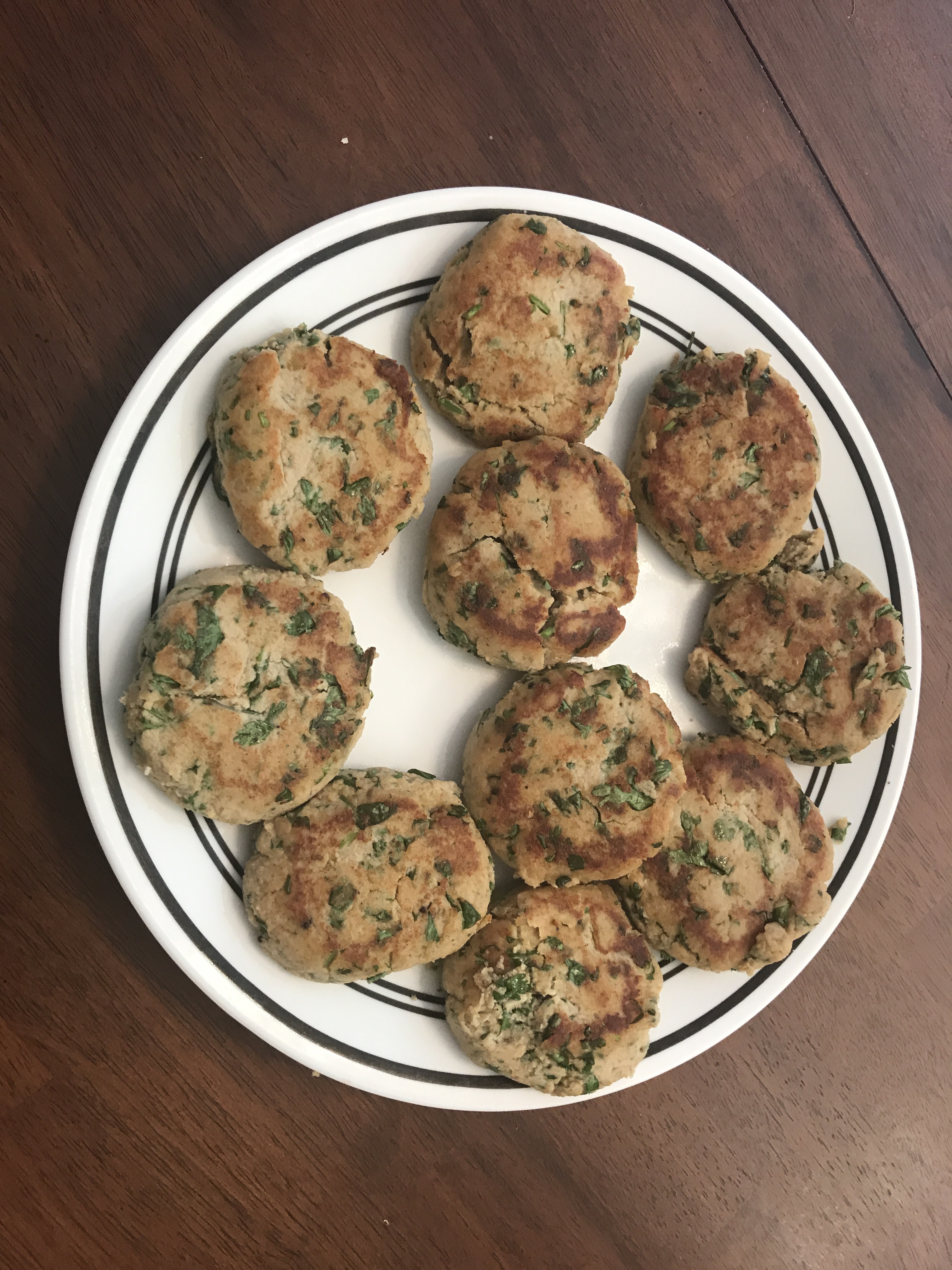 Combine all the ingredients in a pot except egg and oils. Add 1 1/2 cup water and cook it on medium till all ingredients are cooked and the water has evaporated. After this mixture has cooled down, grind it in the food processor with the egg. Divide the mixture into 12 equal parts and make patties and fry 2 or 3 at a time in a small frying pan putting about a tablespoon of oil per batch.
