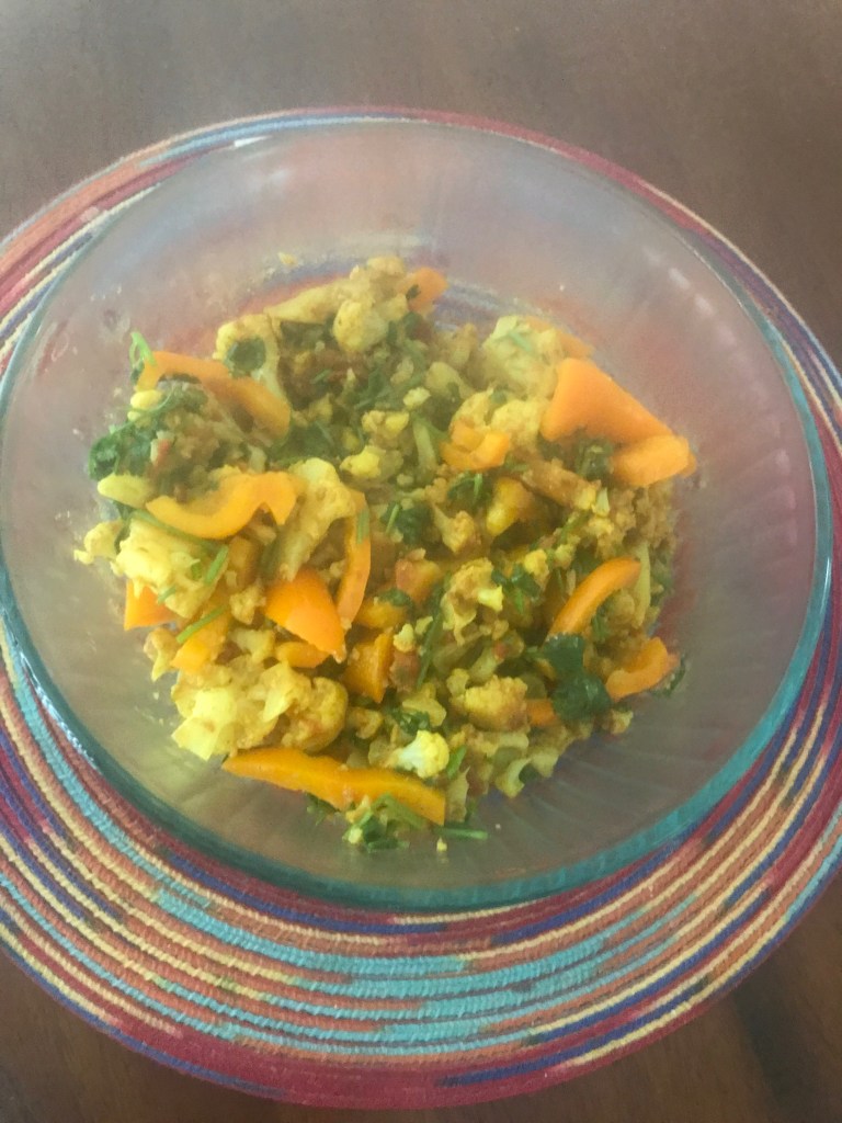 Cook all above ingredients except the cauliflower and bell peppers on medium low for 10-15 minutes. Then add cauliflower and keep on medium for 10-15 minutes. Then add bell pepper and cilantro and remove from the hot stove and let it sit for 5 more minutes. Then put it in a bowl and serve with chapatti or without.